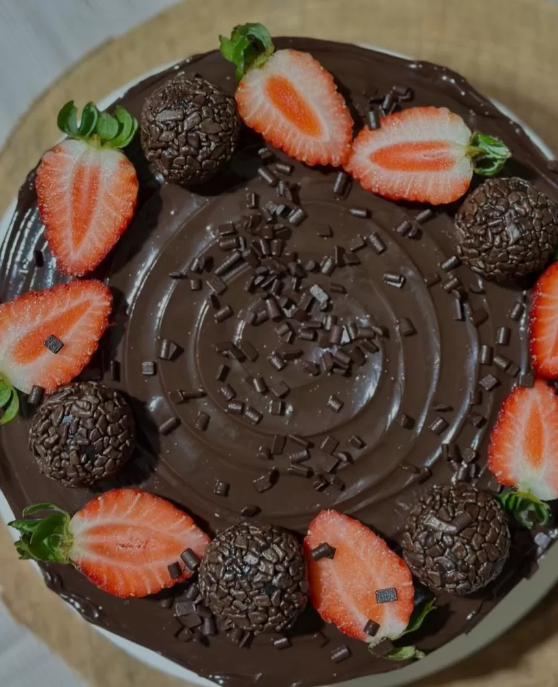Massa de chocolate, recheio de chocolate 50%, com cobertura de ganache de chocolate.